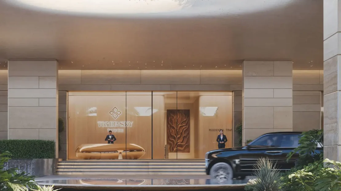 Tiger Sky Tower will be a 532-metre-tall skyscraper by Tiger Properties in Business Bay. The off-plan project will offer 1–4 bedroom apartments, penthouses, and a royal sky penthouse. It features the world's highest rainforest at 447m and the highest infinity pool at 431m with panoramic Dubai skyline views. The tower will also include a 439m high restaurant. سيكون برج تايغر سكاي ناطحة سحاب بارتفاع 532 مترًا من تطوير تايغر العقارية في بيزنس باي. يوفر المشروع شققًا من 1 إلى 4 غرف نوم، بنتهاوس، وبنتهاوس ملكي. يتميز بأعلى غابة مطيرة في العالم على ارتفاع 447 مترًا، وأعلى مسبح لا متناهي على ارتفاع 431 مترًا مع إطلالات خلابة، بالإضافة إلى مطعم على ارتفاع 439 مترًا.
